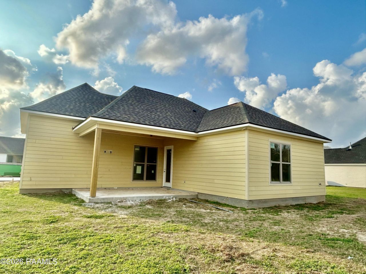 Energy Star-certified new construction home located in the highly sought after community of Couret Farms! Featuring the Celine Transitional floorplan with 3 bedrooms and 2 bathrooms across 1,753 square feet, this floorplan allows function and style in a spacious layout. The tray ceiling adds architectural detail to the living area, where a ventless gas fireplace with a wood mantle and tile surround creates a warm focal point. The kitchen is finished with custom cabinetry featuring soft-close cabinet doors and included hardware, slab countertops, a 30-inch gas slide-in range with a microwave hoodvent combo, and a garbage disposal for everyday ease. The layout is designed to flow comfortably into the main living spaces, supporting both daily living and entertaining. The bathroom spaces include a custom tile shower with a frameless glass door and niche, along with a garden tub with tile surround that offers a relaxing retreat. A large primary closet provides generous storage, while a cubby area near the rear entry by the garage adds extra organization. A tankless gas water heater completes this home, offering efficient performance and modern convenience throughout. Schedule your appointment today!