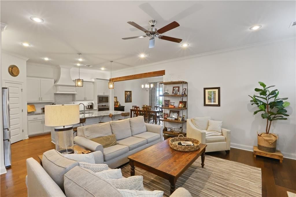 Conveniently located just seconds from I-12! Step onto the inviting front porch and enter a welcoming foyer that opens into a bright, spacious, and fully open living, kitchen, and dining area perfect for everyday living and entertaining. The chef inspired kitchen features custom cabinetry with 5" hardware, a large center island with sink and stylish pendant lighting, a walk in pantry, GE stainless steel appliances including a gas range, and 3 cm granite countertops complemented by a gorgeous herringbone backsplash. The private primary suite offers dual vanities, a relaxing soaking tub, a beautifully tiled shower with seamless glass door, and a huge walk in closet. Enjoy wood flooring throughout all living areas and bedrooms..no carpet!..along with a large covered patio just off the dining room, ideal for outdoor dining or relaxing.