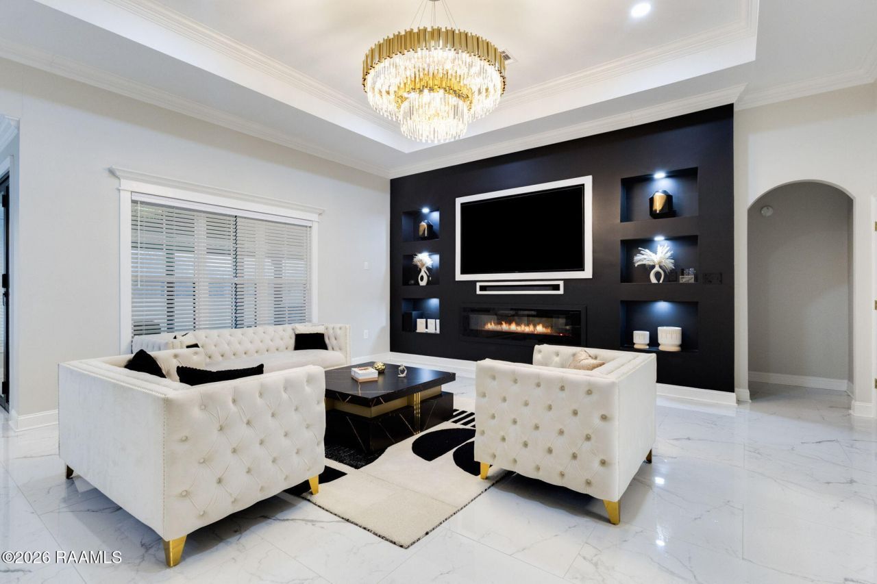 Set on 2.46 sprawling acres, this nearly new, 2-year-old custom home blends refined elegance with modern comfort. Step inside to discover high-end finishes throughout, including 48x24 marble tile flooring, marble countertops, and stunning chandeliers that elevate every space. The gourmet kitchen is a showstopper, featuring a walk-in pantry, wine fridge, 5-burner cooktop, and double ovens. Perfect for entertaining and everyday luxury. Indoor and outdoor living seamlessly connect to a 743 sq. ft. covered patio with motorized screens and a fully equipped outdoor kitchen, ideal for year-round enjoyment. Inside, a dedicated movie room offers flexibility to serve as a home office or 5th bedroom. Elegant French doors with intricate scrollwork add timeless character, while the spacious primary suite provides a true retreat. The spa-inspired primary bath features dual vanities, a soaker tub with handheld shower, and a separate shower with multiple shower heads and massage jets.Thoughtful design details and elegant fixtures are found throughout the home. With ample space to park a camper or recreational vehicles, as well as soffit lighting around this property which offers both luxury and practicality, all in a serene, expansive setting.