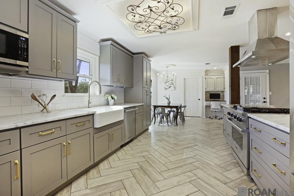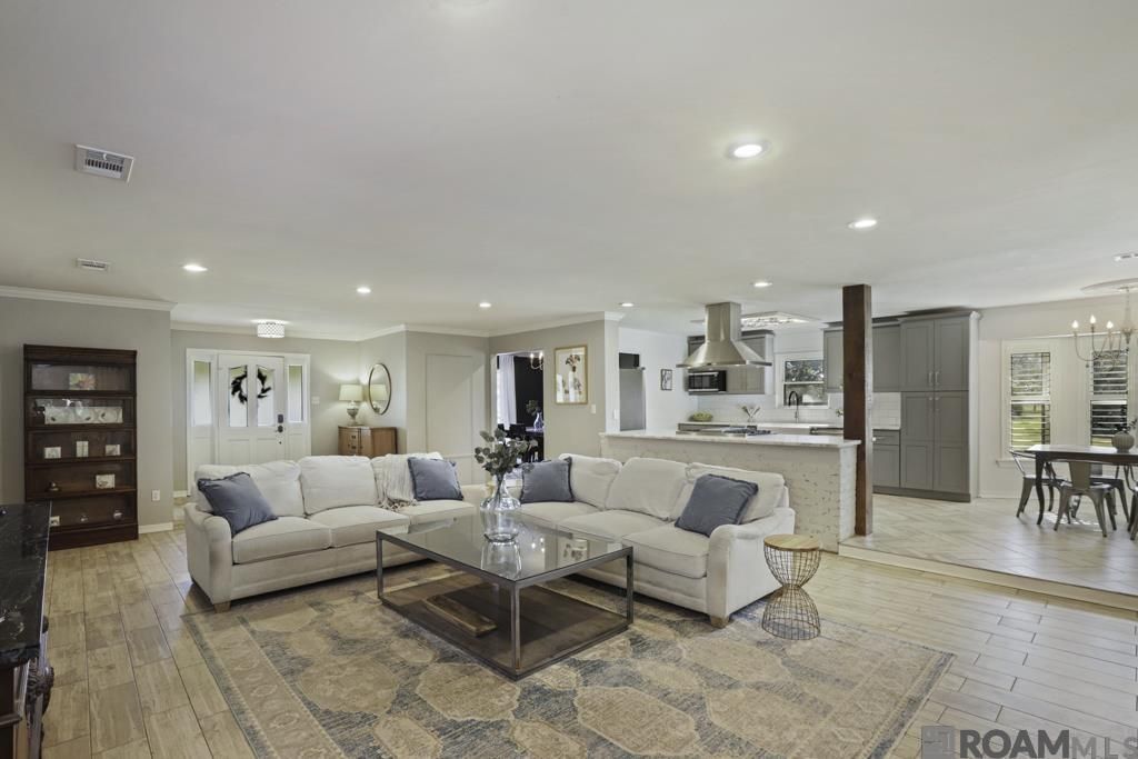 Sunset Paradise. Workshop Heaven. Unicorn Alert. Picturesque 2 acres w/ Mature Pecan trees with dream-home extras, an Outdoor Cooking Pavillion, a massive workshop, and a bonus Office/Workout Room! Space & Style! Beautifully updated home with Gourmet kitchen steals the spotlight with custom cabinetry, slab quartz counters, Viking range and dishwasher, new hood, tile backsplash, shiplap touches, and herringbone-pattern wood tile floors. The open kitchen"to-living layout features a cypress beam and a wood-burning fireplace for cozy evenings. Carrara marble counters in both full bathrooms with wood-look hex tile floors. The primary suite offers comfort and convenience with two walk-in closets. Windows were replaced in 2016 for peace of mind. Outside, you'll find an attached 2-car garage plus converted boat port that makes for an ideal office or fitness room. Exceptional 1,500 sq ft detached workshop, perfect for hobbies, projects, or storage, along with an additional separate storage shed. And for those who love to host? The large, covered outdoor cooking pavilion is the ultimate hangout spot.