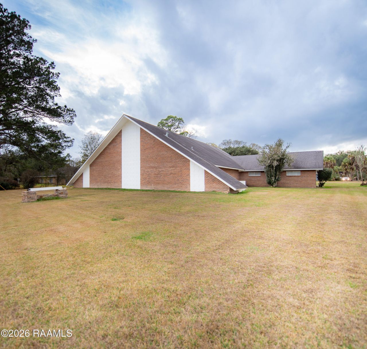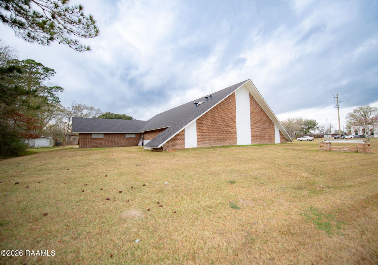Custom built in 1967 as a place of worship, this 5,342 square foot one-story brick structure sits on 1.23 acres on a corner lot, just outside the city limits of Opelousas. It offers an amazing location with exceptional visibility in a high traffic area near shopping, banking and I-49. Designed in a striking mid-century modern A-frame style, the building features an eye-catching architectural presence with a minimalist, sleek and highly functional design. Inside, the property offers a spacious open floor plan highlighted by soaring tongue-in-groove wood ceilings that create warm, inviting tones to a true sense of sanctuary. Existing improvements include a covered portico, baptistry, sanctuary, vestibule, seven classrooms/office areas, and two bathrooms, allowing for immediate functionality while still offering endless possibilities for reconfiguration or expansion. The large lot provides ample room for additional parking, further enhancing its flexibility. Potential uses are noted as a worship center, reception or event hall, office or retail space, daycare or adult daycare, and more. Appraised in 2025, this property combines practical design, versatility and location, making it a rare opportunity for a wide range of commercial or community-focused uses.