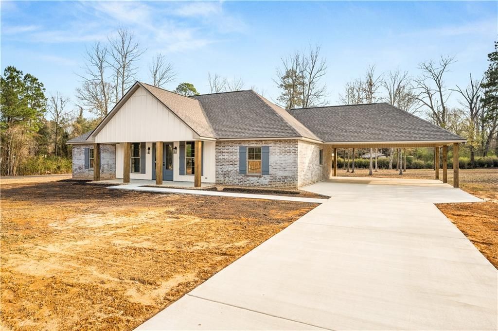 This beautiful new construction home features upgraded finishes with a modern, sleek edge. Set on a spacious 1.33 acre lot, the property offers plenty of room to enjoy, along with a convenient two car carport and wrap around patio. Inside, you will find a well designed three bedroom split floor plan with an open concept layout that feels bright and welcoming. The kitchen island overlooks the open living area, making it ideal for everyday living and entertaining. The brick fireplace adds warmth and character to the living room and the windows let in plenty of natural light. Located in Deville, this new construction home combines contemporary style with comfortable living. Homes like this do not last long, so if you have been looking, this may be your chance!