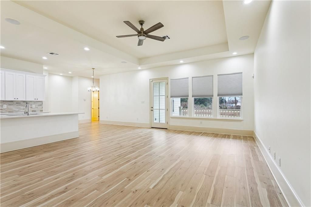 Welcome to this stunning custom-built home completed in 2023, where thoughtful design meets modern comfort. Offering 4 bedrooms and 2.5 baths, this beautifully crafted residence showcases soaring 12-, 11-, and 10-foot ceilings that create an open, airy feel throughout. Light engineered wood flooring flows seamlessly through the living spaces, complemented by tile flooring in the bathrooms for both style and durability. Elegant millwork and custom cabinetry add character and craftsmanship at every turn. The heart of the home is a gorgeous island kitchen featuring built-in stainless steel appliances, beautiful light stone countertops, abundant custom cabinetry, and generous workspace ? perfect for entertaining or everyday living. Both full bathrooms offer double vanities for added convenience. The primary suite is a true retreat, featuring a luxurious bath with a large soaking tub and an expansive tiled walk-in shower designed for relaxation. Additional highlights include surround sound throughout the home and a spacious laundry room with washer and dryer already installed. Equipped with energy-efficient double-insulated windows, this home is designed for comfort and efficiency. Situated on an oversized lot overlooking a water way you'll enjoy peaceful views from the covered back porch ? an ideal setting for morning coffee or evening relaxation.
