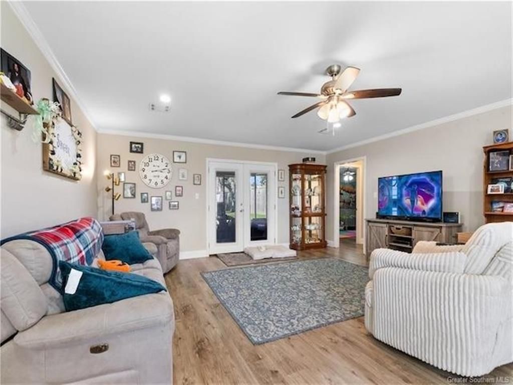 Welcome to your dream home! This stunning 3-bedroom, 3- full bath residence features two luxurious master suits, perfect for ultimate comfort and privacy. The spacious split floorplan showcases a grand living room that flows seamlessly into the beautifully remodeled kitchen, boasting custom cabinets and a state of the art 5 burner Samsung oven with all the latest features. Enjoy the elegance of granite countertops throughout, complemented by gorgeous vinyl wood plank floors and a tasteful beveled door package, all enhanced by crown molding and wooden blinds. Step outside to your expansive fenced in backyard, a sprawling 70'x220' oasis with plenty of space for outdoor activities and entertaining. Relax in the screened-in back patio, making this the perfect blend of luxury and comfort after its exquisite renovation post-Hurricane Laura. Don't miss this incredible opportunity.